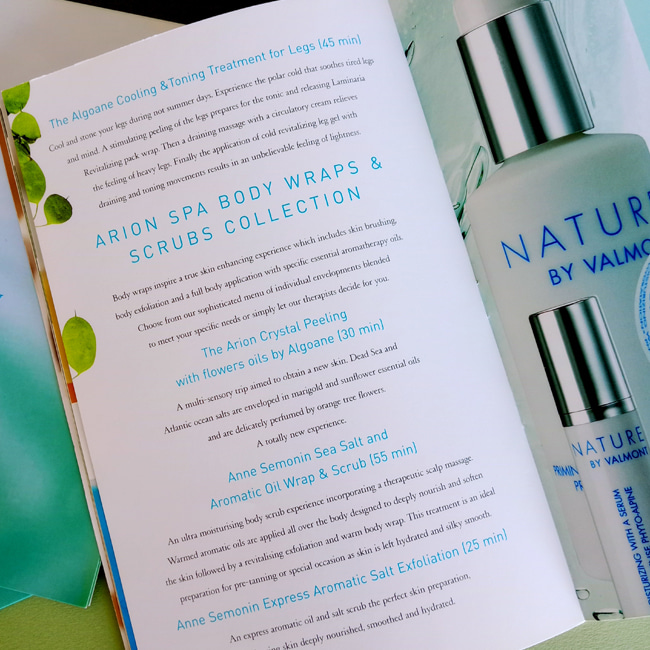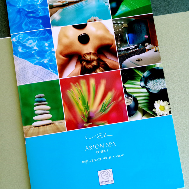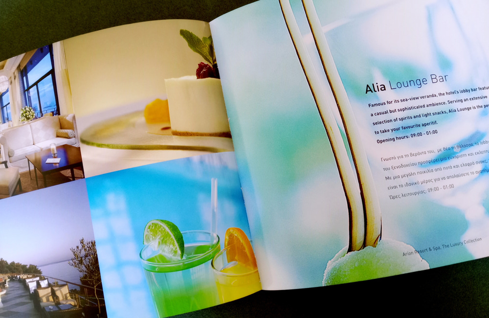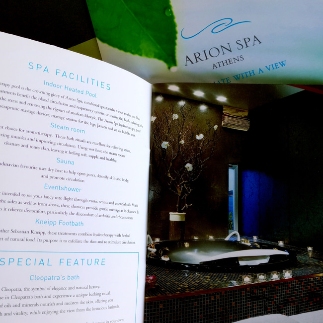 Ο σχεδιασμός του εντύπου για το Arion Spa Athens του Astir Palace Hotel Athens αποτελεί μια άσκηση ισορροπίας ανάμεσα στην αισθητική πολυτέλεια, τη χαλάρωση και την ευεξία. Το έντυπο καλείται να μεταφέρει στον αναγνώστη την εμπειρία ενός καταφυγίου ηρεμίας, όπου η φύση, η επιστήμη της ευεξίας και οι εξειδικευμένες θεραπείες συνδυάζονται για να προσφέρουν απόλυτη αναζωογόνηση. Η σχεδίαση βασίζεται σε μια minimal και κομψή αισθητική, με μια προσεγμένη ισορροπία ανάμεσα στην αρμονία των εικόνων και την καθαρότητα του κειμένου. Υλικά υψηλής ποιότητας, όπως χαρτί με βελούδινη υφή και ανάγλυφες λεπτομέρειες, αποτυπώνουν τη διακριτική πολυτέλεια του spa. Η χρωματική παλέτα είναι εμπνευσμένη από το υδάτινο στοιχείο και τη φύση, με απαλούς τόνους του γαλάζιου, του πράσινου και του λευκού, δημιουργώντας μια αίσθηση ηρεμίας από την πρώτη κιόλας σελίδα.