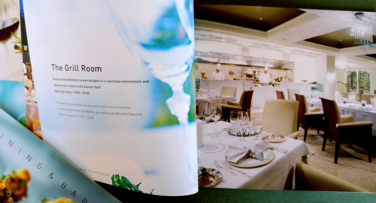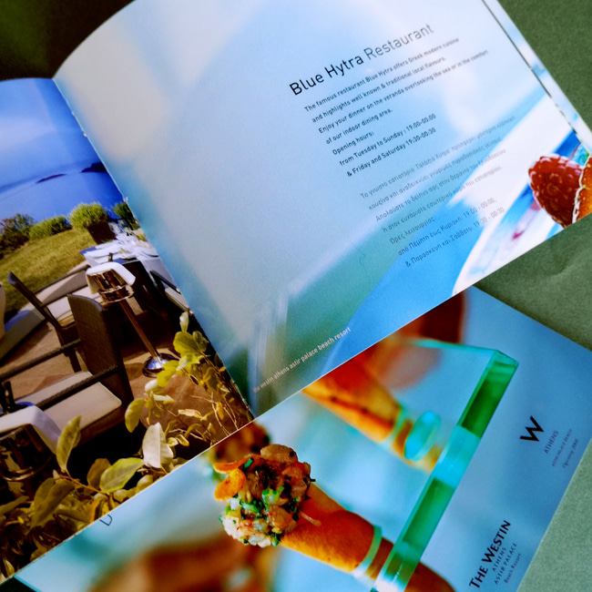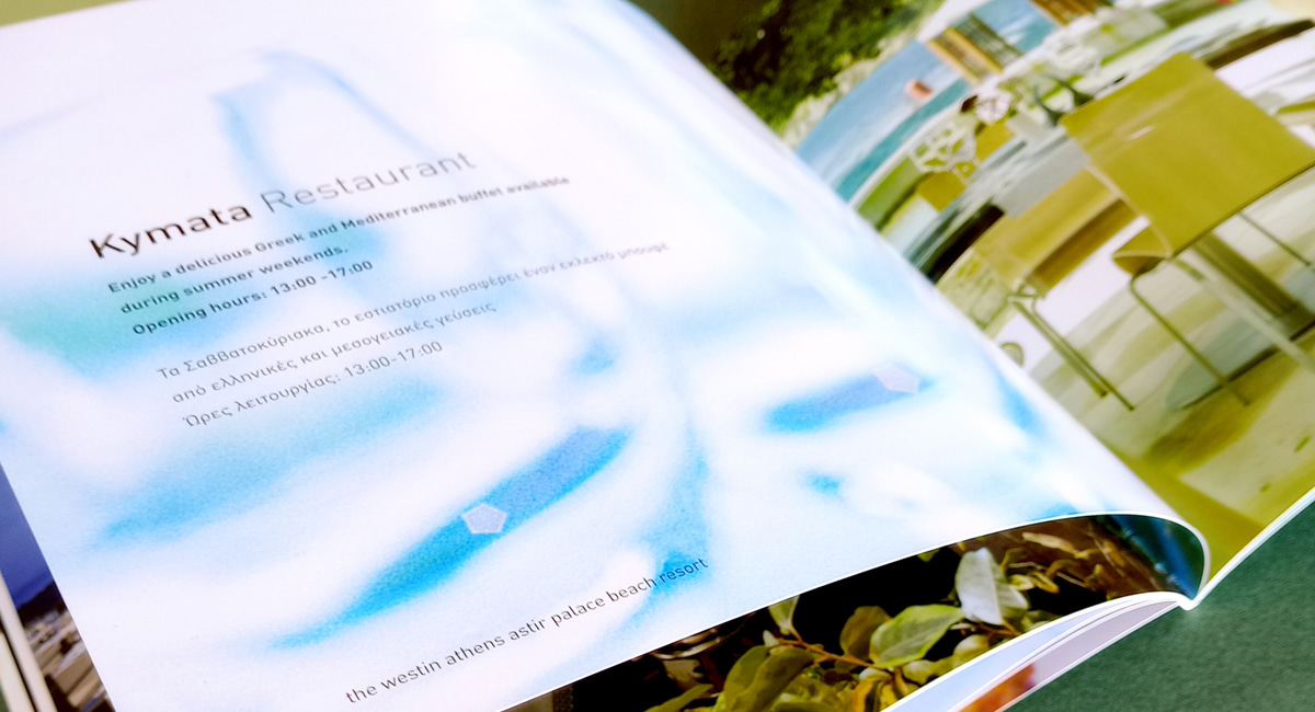 Η δημιουργία ενός πολυτελούς εντύπου που παρουσιάζει όλα τα εστιατόρια και bars του Astir Palace Hotel, Athens αποτελεί έναν αρμονικό συνδυασμό υψηλής αισθητικής, αφηγηματικής τέχνης και μιας εκλεπτυσμένης προσέγγισης στη φιλοξενία. Το έντυπο αυτό λειτουργεί ως μια πρόσκληση για εξερεύνηση ενός γαστρονομικού κόσμου όπου οι γεύσεις, η ατμόσφαιρα και η άψογη εξυπηρέτηση συνυπάρχουν για να δημιουργήσουν μια ανεπανάληπτη εμπειρία. Σχεδιασμένο με μια αισθητική που αντικατοπτρίζει την κομψότητα και την αποκλειστικότητα του resort, το έντυπο διαθέτει μια επιμελημένη διάταξη που αποτυπώνει την ουσία κάθε χώρου εστίασης. Η χρήση υλικών υψηλής ποιότητας, πολυτελών φινιρισμάτων και εκλεπτυσμένης τυπογραφίας δημιουργούν μια αίσθηση που αντικατοπτρίζει τη φινετσάτη ατμόσφαιρα του Astir Palace. Μια ισορροπημένη χρωματική παλέτα, εμπνευσμένη από τη φυσική ομορφιά της Βουλιαγμένης, δημιουργεί το ιδανικό φόντο για ένα γαστρονομικό ταξίδι στο resort.