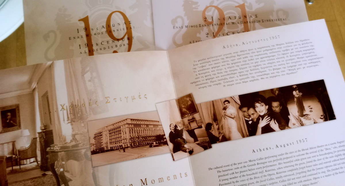 Στην καρδιά της Αθήνας, το Ξενοδοχείο Μεγάλη Βρεταννία στέκεται ως ζωντανό μνημείο της ελληνικής ιστορίας, έχοντας φιλοξενήσει μέσα στους αιώνες βασιλείς, διπλωμάτες, καλλιτέχνες και προσωπικότητες που συνέβαλαν στη διαμόρφωση της πολιτιστικής και πολιτικής ταυτότητας του τόπου. Τα τρία συλλεκτικά έντυπα Golden Moments, αφιερωμένα στον 19ο, 20ό και 21ο αιώνα, ζωντανεύουν αυτή την πλούσια κληρονομιά μέσα από ένα αφήγημα που συνδυάζει την κομψότητα, τη μνήμη και τον υψηλού επιπέδου σχεδιασμό. Κάθε έντυπο έχει σχεδιαστεί με προσοχή στη λεπτομέρεια, με εκλεπτυσμένη τυπογραφία, φωτογραφίες σε σέπια τόνους και χρυσές λεπτομέρειες που αποπνέουν τη μεγαλοπρέπεια της εποχής που εκπροσωπούν, αποτελώντας όχι μόνο αφηγηματικά αλλά και αισθητικά έργα τέχνης.