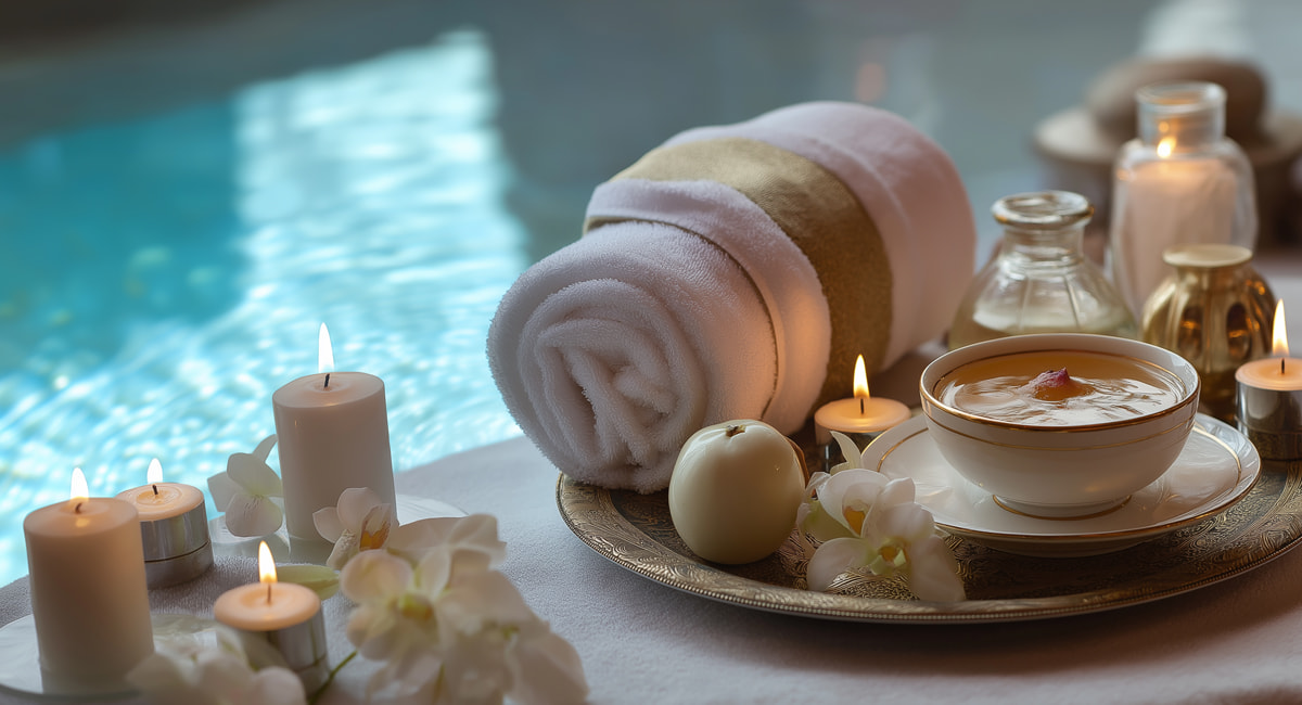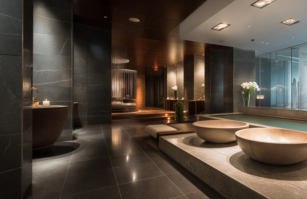 Οι αποχρώσεις που χρησιμοποιούνται — όπως το κεχριμπαρί, η τερακότα και το λαδί — εναλλάσσονται με πιο ψυχρούς τόνους, όπως το γαλάζιο, το λευκό και υφές που παραπέμπουν σε μάρμαρο, δημιουργώντας ένα οπτικό περιβάλλον που είναι ταυτόχρονα χαλαρωτικό και αναζωογονητικό. Η αντίθεση αυτή αντανακλά την διττή φιλοσοφία του spa: ηρεμία και ενέργεια, ξεκούραση και ανανέωση.