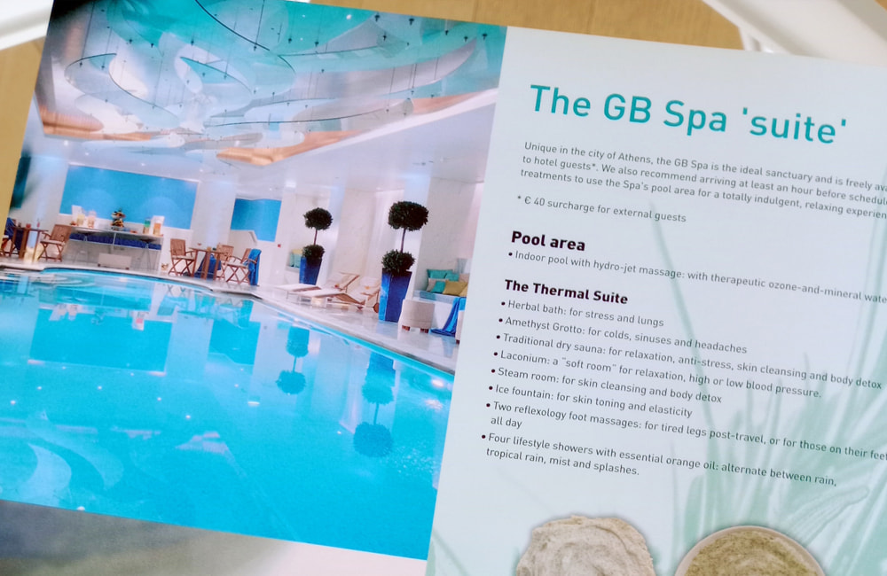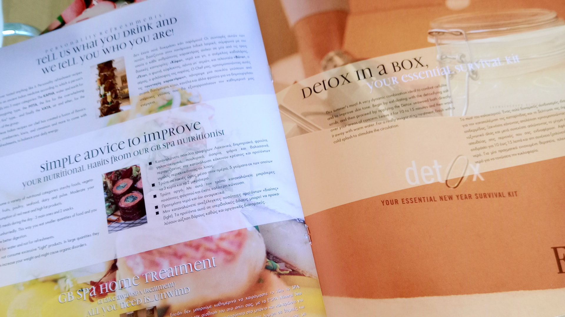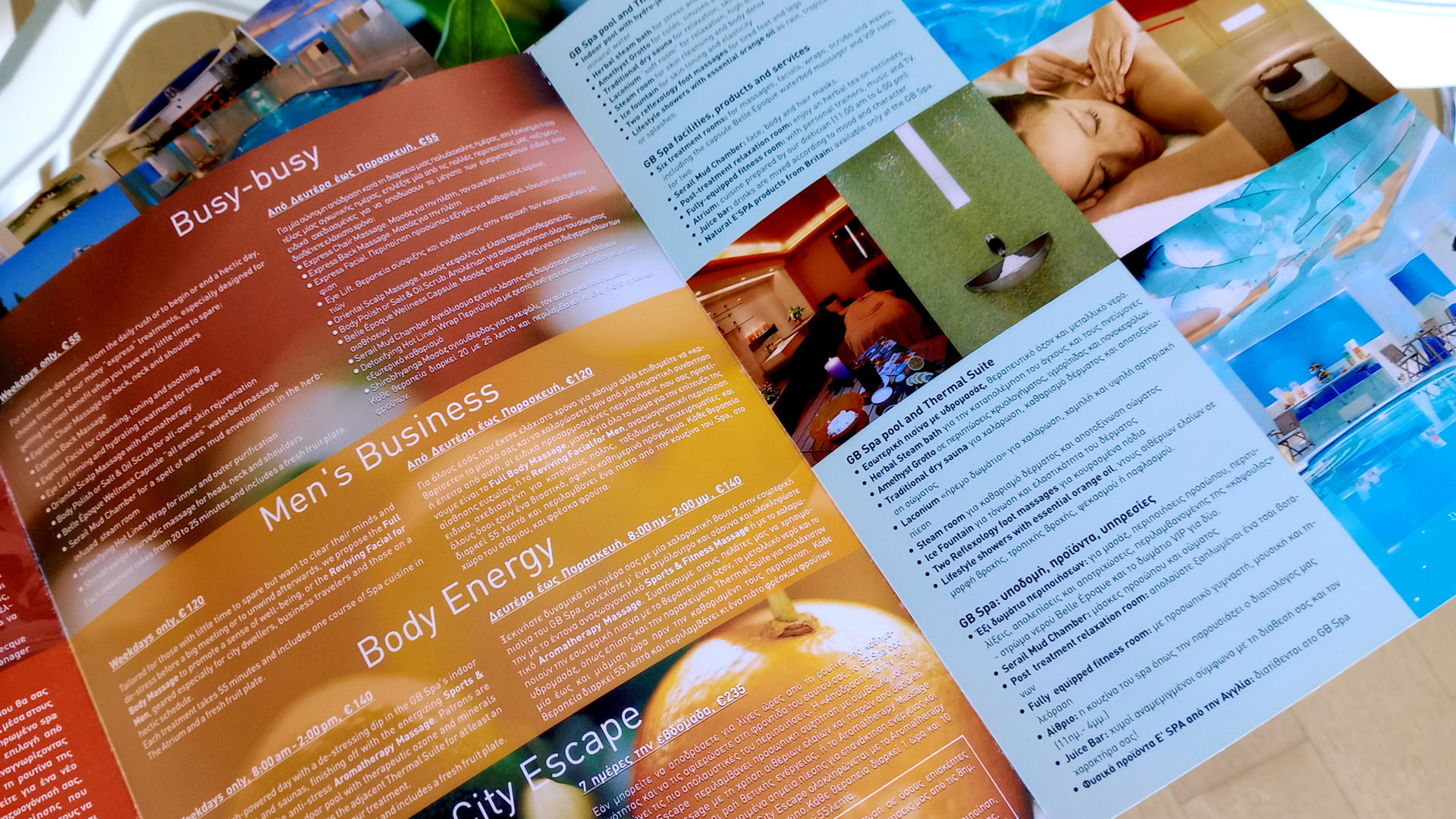 Ο σχεδιασμός των εντύπων του GB Spa, το οποίο στεγάζεται στο εμβληματικό ξενοδοχείο Μεγάλη Βρεταννία στην καρδιά της Αθήνας, αποτυπώνει με εξαιρετική επιμέλεια έναν κόσμο ευεξίας, πολυτέλειας και αισθητικής αρμονίας, προσεγγίζοντας την παρουσίαση του spa όχι απλώς ως υπηρεσία, αλλά ως ολόκληρο τρόπο ζωής. Η εικαστική γλώσσα των εντύπων αναδεικνύει μια απαλή, αισθητηριακή εμπειρία μέσω υψηλής ποιότητας φωτογραφιών, χαλαρωτικών χρωματικών παλετών, εκλεπτυσμένης τυπογραφίας και ισορροπημένων συνθέσεων που εναλλάσσουν την πληροφόρηση με την έμπνευση.