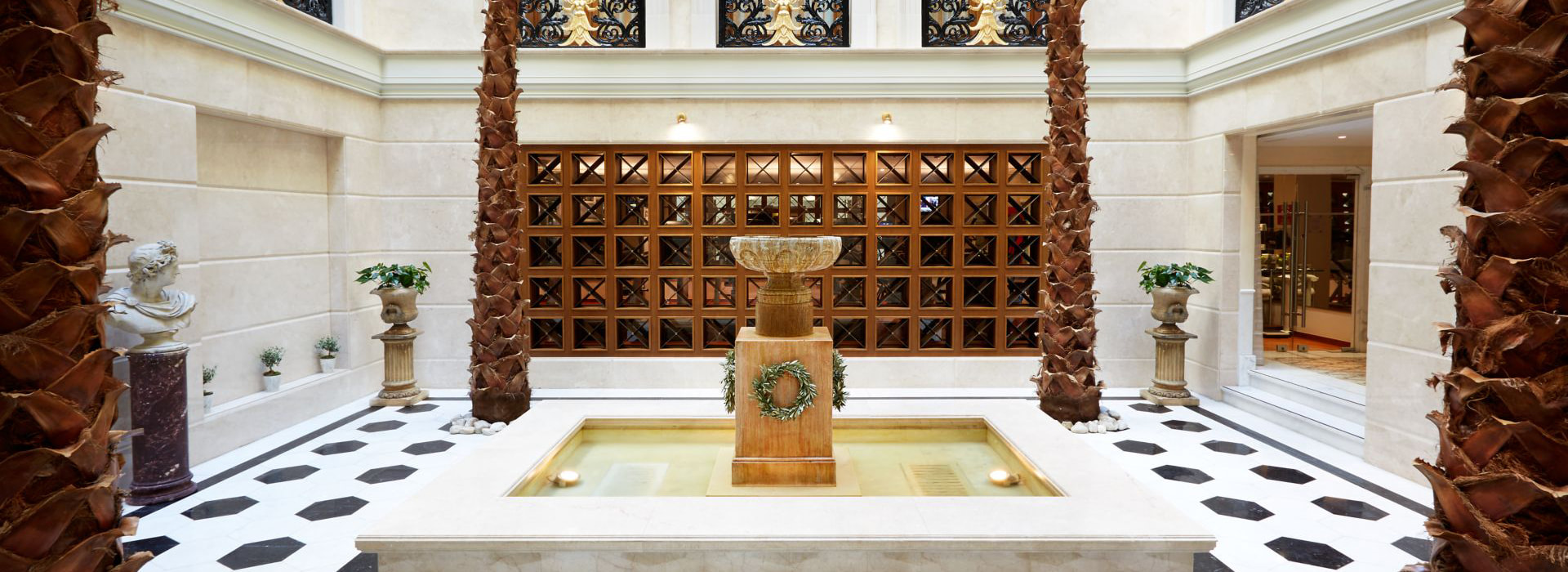 Κάθε εικόνα αναδεικνύει διαφορετικές πτυχές του Spa, όπως τον κεντρικό χώρο υποδοχής με τη νεοκλασική επιρροή και τα πολυτελή έπιπλα, τις ξύλινες λεπτομέρειες και την ενσωμάτωση φυσικών στοιχείων, τις σουίτες ανάπαυσης με τις λευκές ξαπλώστρες σε μάρμαρο, τα αιθέρια έλαια και τα προϊόντα ESPA που τονίζουν τη σημασία της ολιστικής φροντίδας, την εσωτερική πισίνα που αποπνέει γαλήνη μέσα από τις απαλές κυανές αντανακλάσεις, καθώς και τη διακοσμητική κρήνη που παραπέμπει σε αρχαιοελληνικά λουτρά.