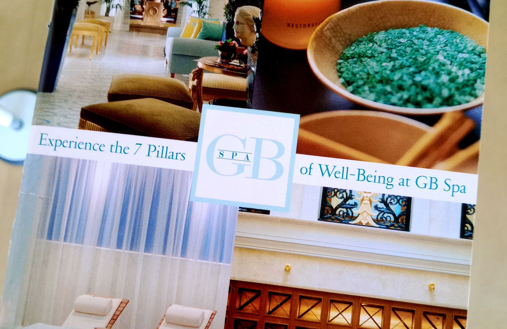 Όλα αυτά οργανώνονται με μια σχεδιαστική γλώσσα καθαρής γεωμετρίας και διακριτικής πολυτέλειας, που υποστηρίζεται από την τυπογραφία του λογοτύπου GB Spa και το κεντρικό μήνυμα “Experience the 7 Pillars of Well-Being”. Το μήνυμα τοποθετείται σε αέρινη γραμματοσειρά πάνω σε λευκό υπόβαθρο που αναδεικνύει το φως και τη διαφάνεια, προσδίδοντας στο έντυπο τον χαρακτήρα ενός κομψού εισαγωγικού αντικειμένου σε έναν κόσμο απόλυτης ηρεμίας και αισθητικής τελειότητας, κάνοντάς το όχι απλώς ενημερωτικό αλλά βιωματικό και καλλιτεχνικό στοιχείο της συνολικής εμπειρίας.