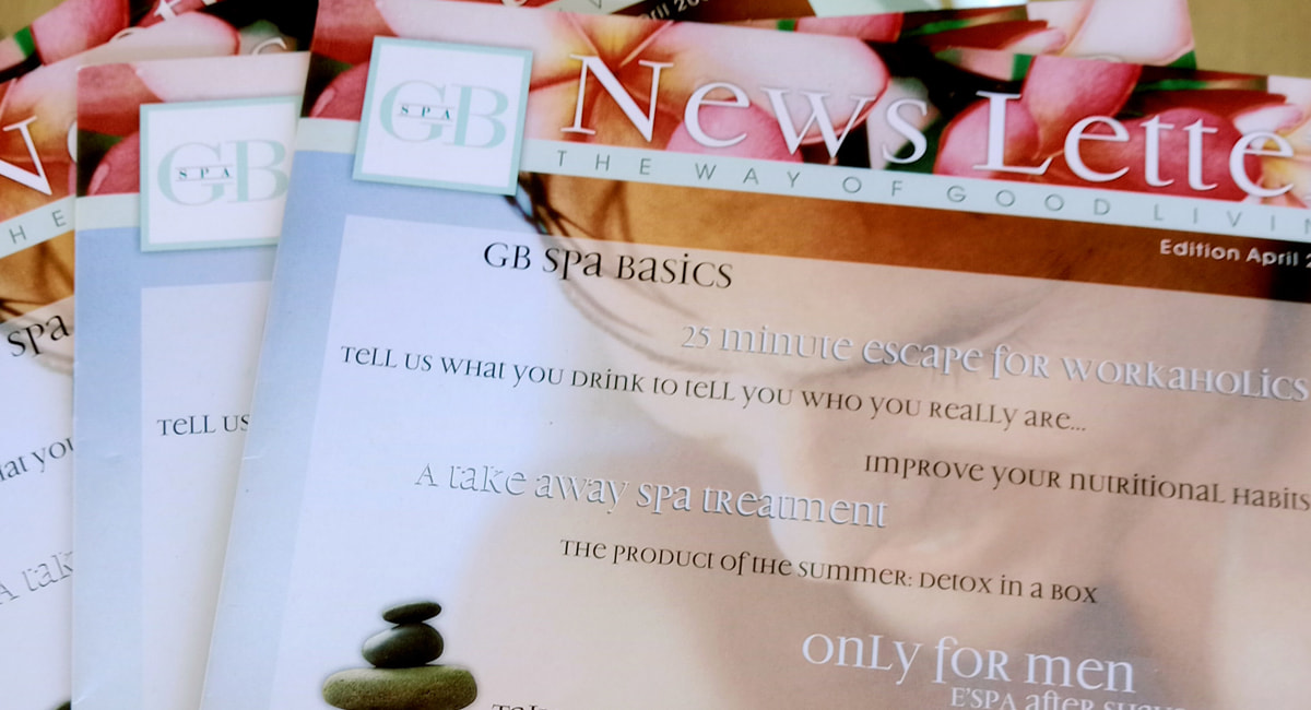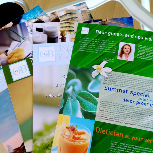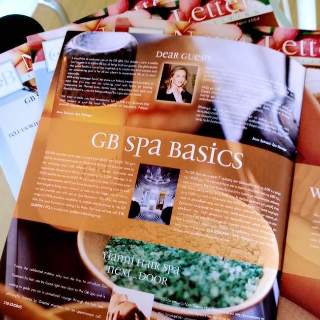 Τα ενημερωτικά φυλλάδια και τα newsletter έχουν ύφος περιοδικού, με φωτογραφίες πλήρους σελίδας που παρουσιάζουν σκηνές από τελετουργίες spa, ήρεμους εσωτερικούς χώρους, signature προϊόντα και εποχικές θεραπείες.