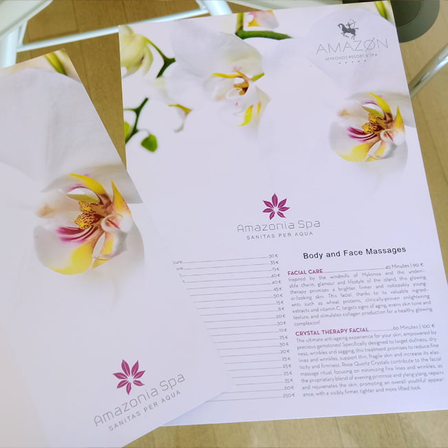 Η καλαίσθητη και φρέσκια προσέγγιση των εντύπων του Amazonia Spa ενισχύει την αίσθηση πολυτέλειας και προσφέρει στους επισκέπτες μια προεπισκόπηση της μοναδικής εμπειρίας χαλάρωσης και αναζωογόνησης που τους περιμένει στο spa του Amazon Mykonos Resort.