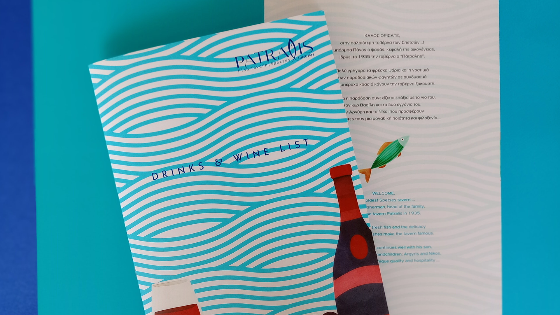 Ο σχεδιασμός των καταλόγων φαγητού και κρασιών αποτυπώνει με οπτική φινέτσα τον θαλάσσιο χαρακτήρα της εμπειρίας. Κυματιστά γραφικά εμπνευσμένα από τη ρευστότητα του νερού καλύπτουν την εξωτερική επιφάνεια, δημιουργώντας μια αίσθηση ηρεμίας, διακριτικής πολυτέλειας και θερινού ρυθμού. Το βλέμμα συναντά χρώματα του γαλάζιου και του τυρκουάζ, τα οποία λειτουργούν ως άμεσες αναφορές στην καθαρότητα και την ελευθερία του ελληνικού καλοκαιριού.