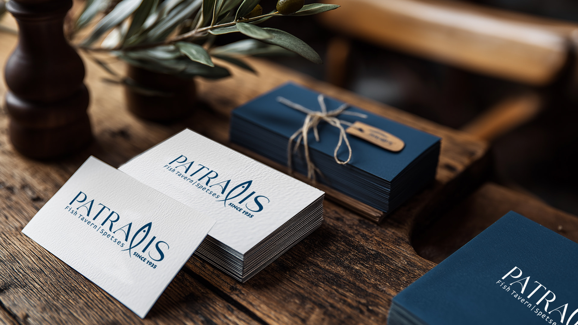 Η χρωματική παλέτα σε σκούρο μπλε παραπέμπει στα καθαρά νερά που περιβάλλουν το νησί, μεταφέροντας την αίσθηση φρεσκάδας, αξιοπιστίας και γαλήνης. Το συνοδευτικό “Fish Tavern | Spetses | Since 1935” δεν είναι απλώς επεξηγηματικό. Λειτουργεί ως σφραγίδα μακροβιότητας και εμπιστοσύνης, επιβεβαιώνοντας ότι εδώ, στο ίδιο σημείο δίπλα στη θάλασσα, οι ίδιες αξίες τηρούνται σχεδόν έναν αιώνα.