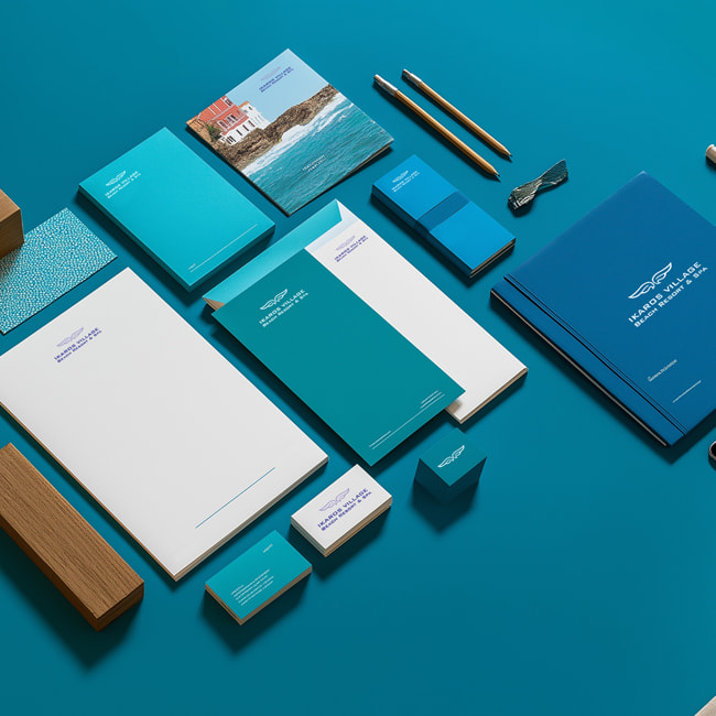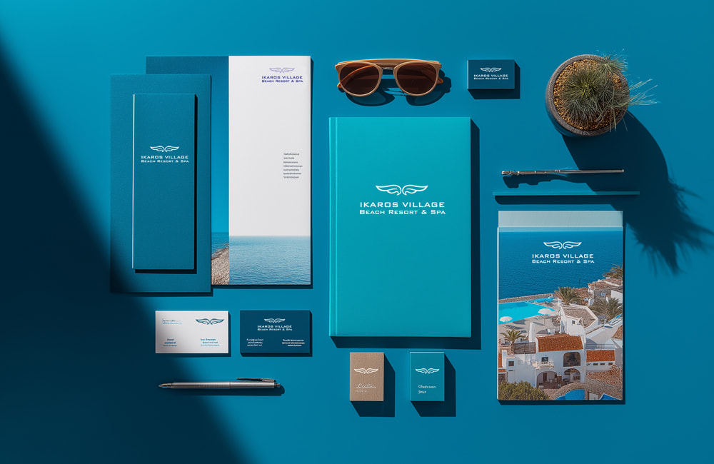 Η τυπογραφία του λογοτύπου συνεχίζει το ίδιο αφήγημα: γεωμετρική αλλά ευγενής, σταθερή αλλά ανάλαφρη. Το “IKAROS BEACH” δεσπόζει με σαφήνεια, ενώ η φράση “LUXURY RESORT & SPA” λειτουργεί σαν υπότιτλος μιας ιστορίας που μόλις αρχίζει — μιας ιστορίας αποσυμπίεσης, ανανέωσης, επαφής με το στοιχείο της φύσης.