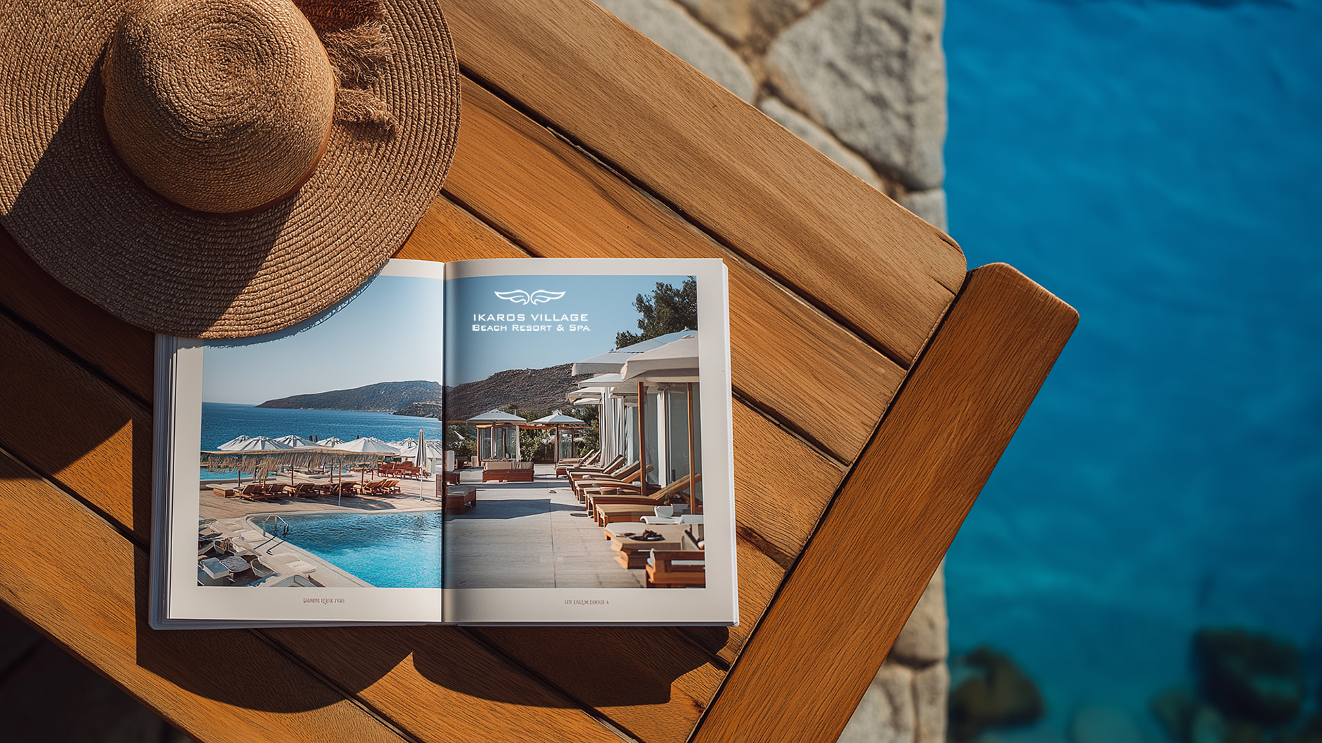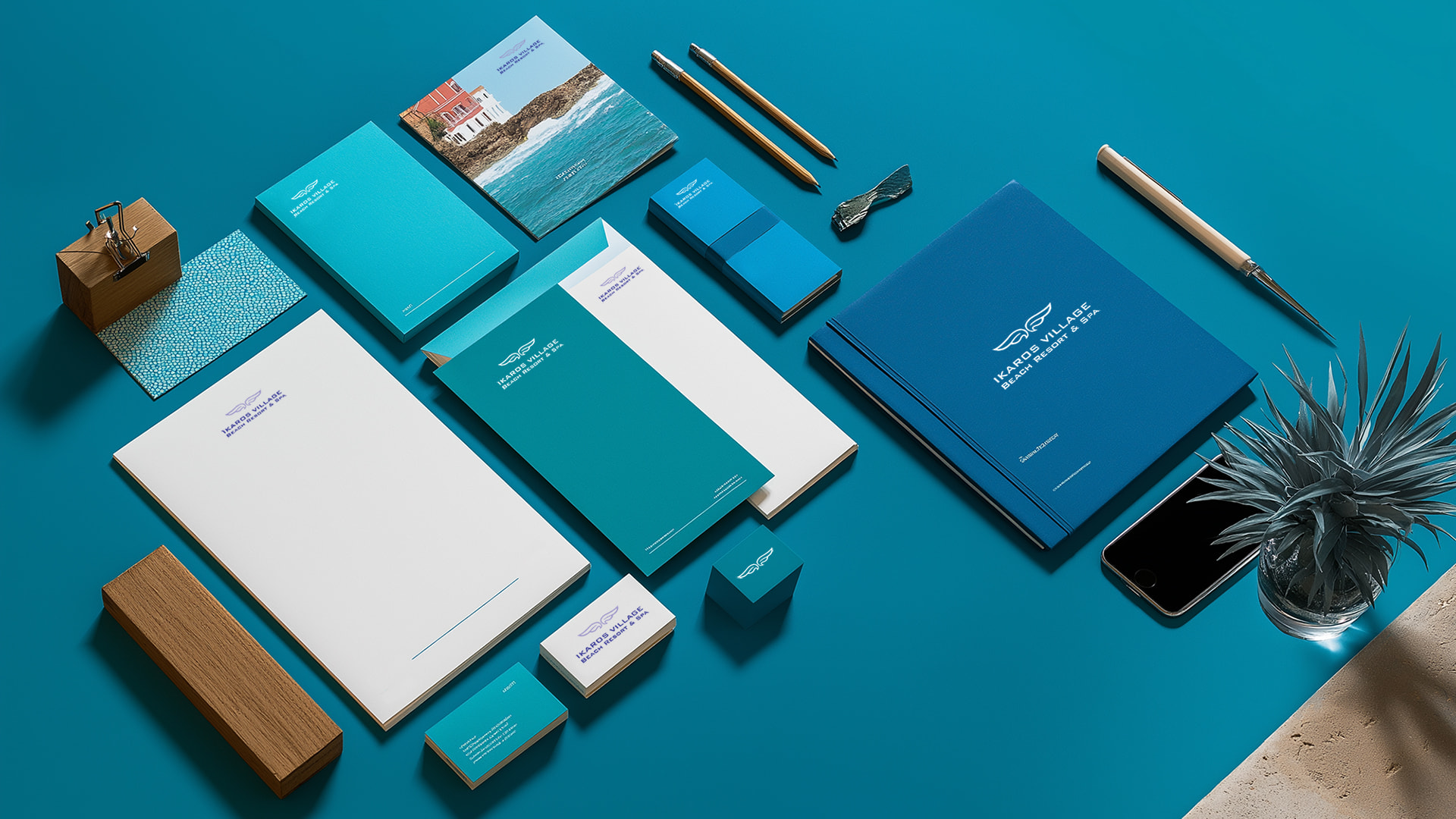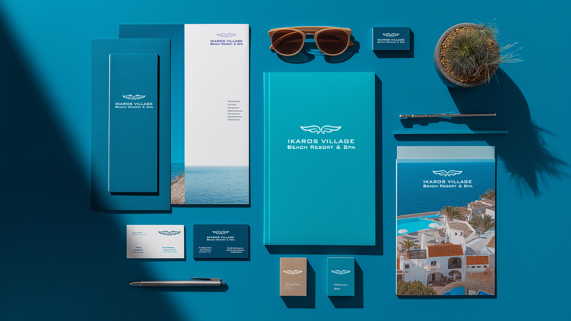 Η τυπογραφία του λογοτύπου συνεχίζει το ίδιο αφήγημα: γεωμετρική αλλά ευγενής, σταθερή αλλά ανάλαφρη. Το “IKAROS BEACH” δεσπόζει με σαφήνεια, ενώ η φράση “LUXURY RESORT & SPA” λειτουργεί σαν υπότιτλος μιας ιστορίας που μόλις αρχίζει — μιας ιστορίας αποσυμπίεσης, ανανέωσης, επαφής με το στοιχείο της φύσης.