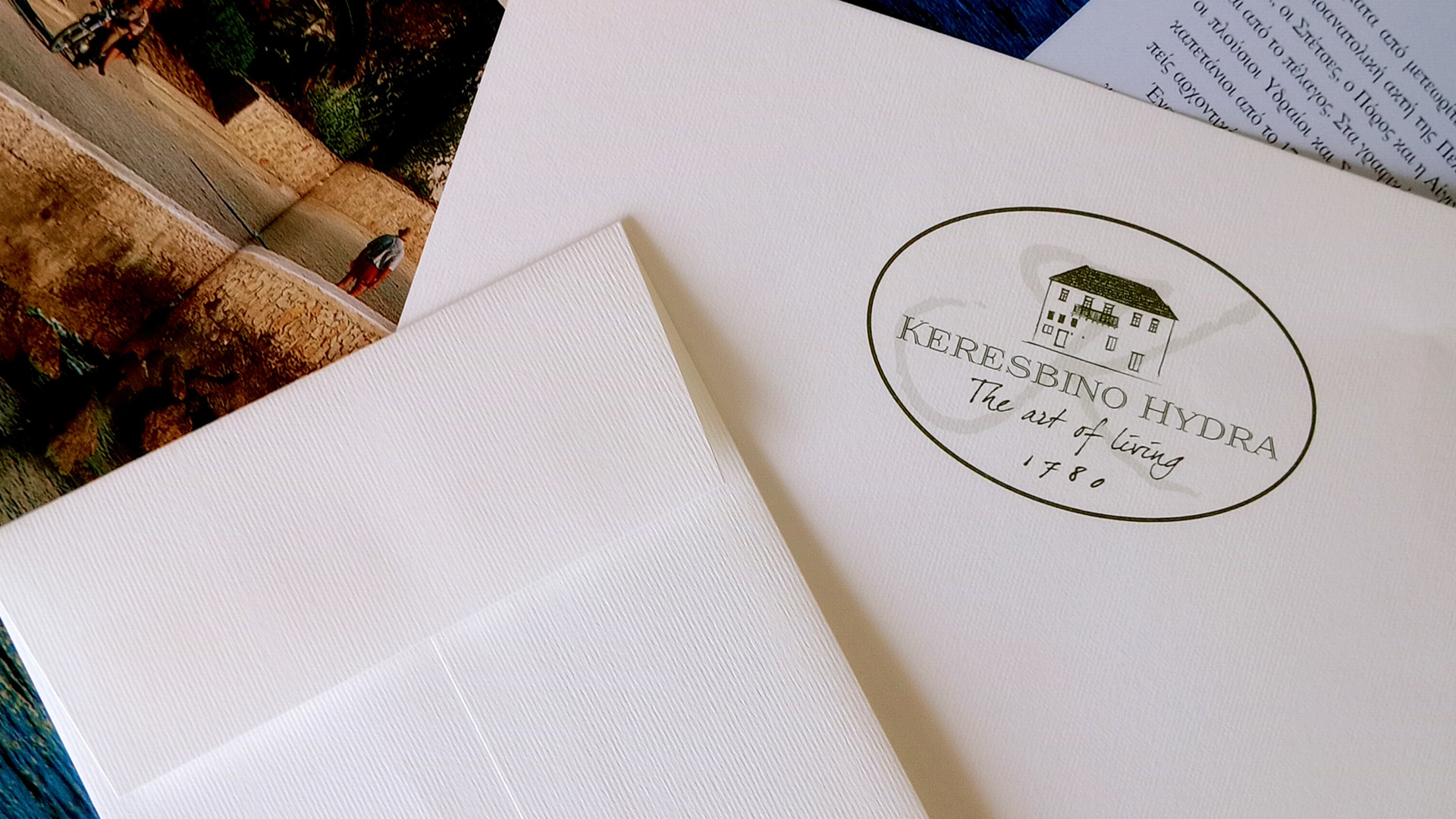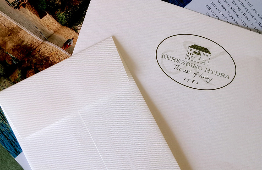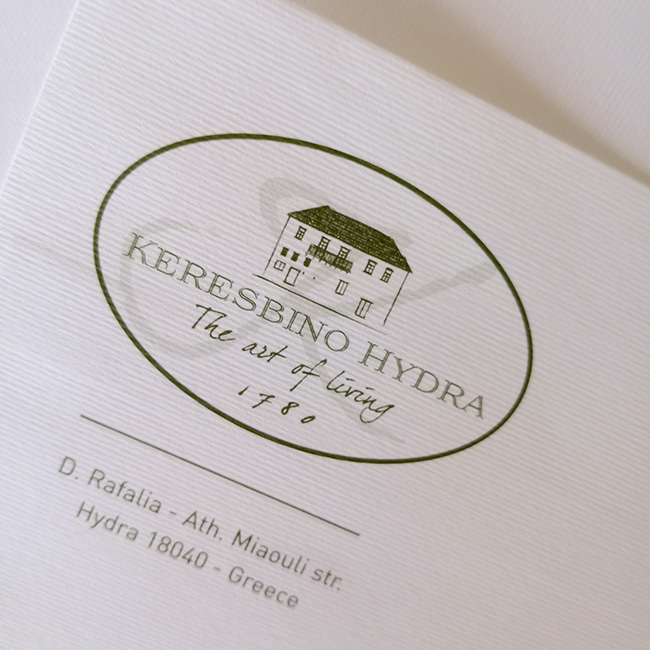 Η προσθήκη του έτους 1780, διακριτική αλλά καθοριστική, λειτουργεί ως χρονογράφημα: δεν μας λέει απλώς πότε χτίστηκε το σπίτι. Μας τοποθετεί μέσα στο ιστορικό συνεχές της Ύδρας — ενός νησιού που δεν κοιτάζει πίσω από νοσταλγία, αλλά από σεβασμό. Η ίδια η φόρμα του λογοτύπου, μέσα σε ένα διακριτικό ελλειπτικό πλαίσιο, θυμίζει παλιό σήμα εισιτηρίου ή σφραγίδα ευγενών επιστολών — σαν να έχει έρθει από μια άλλη εποχή, αλλά να χωράει απόλυτα στη σημερινή.