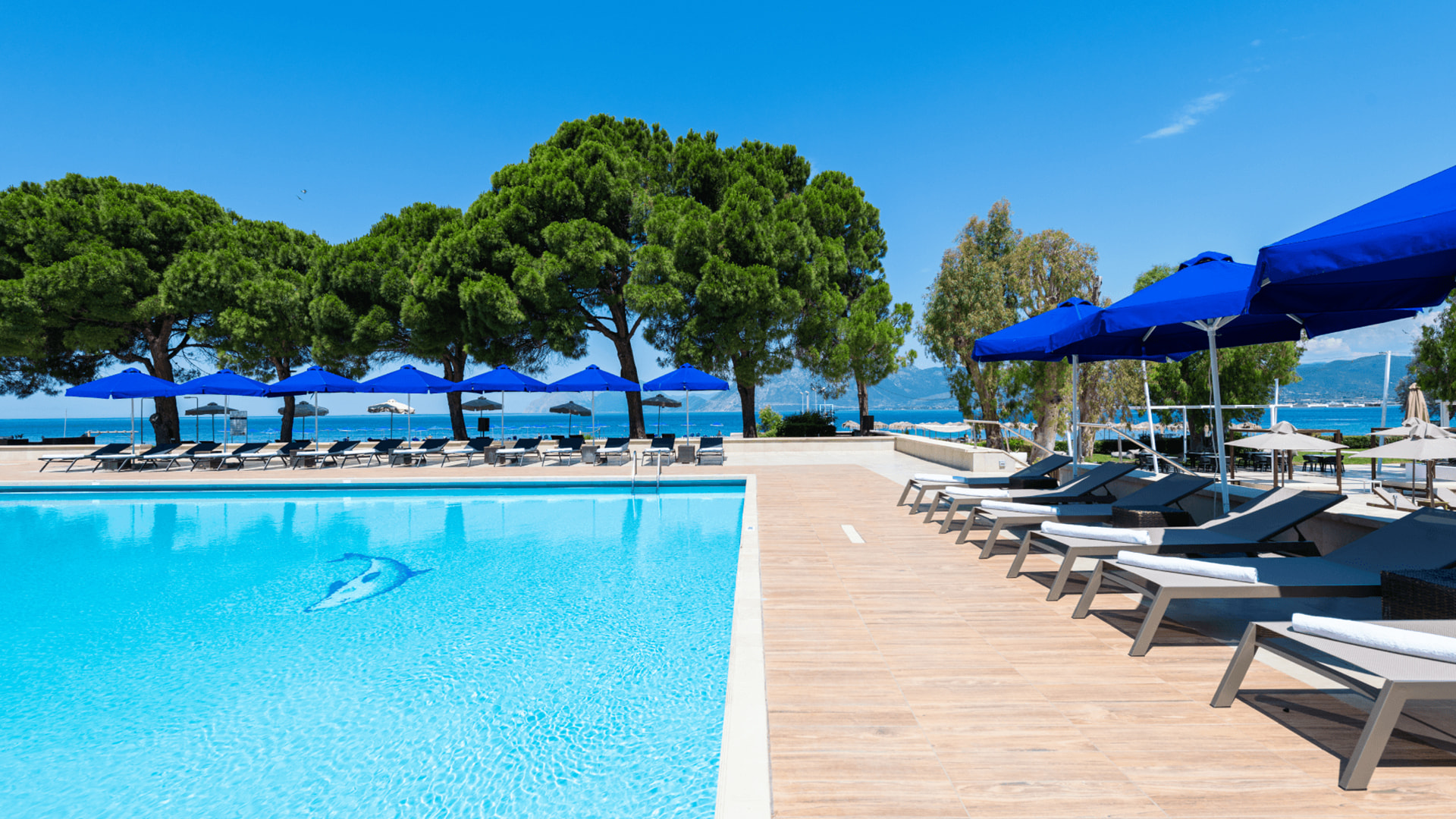 Η τυπογραφία που συνοδεύει το σύμβολο είναι εξίσου ισορροπημένη, με σύγχρονα γράμματα που αναδεικνύουν την κοσμοπολίτικη ταυτότητα του ξενοδοχείου και παραμένουν διαχρονικά. Το χρώμα του λογοτύπου, συχνά σε γήινους ή ναυτικούς τόνους, ενισχύει τη σύνδεση με το φυσικό περιβάλλον – τη θάλασσα, την άμμο και το πράσινο των κήπων του συγκροτήματος.