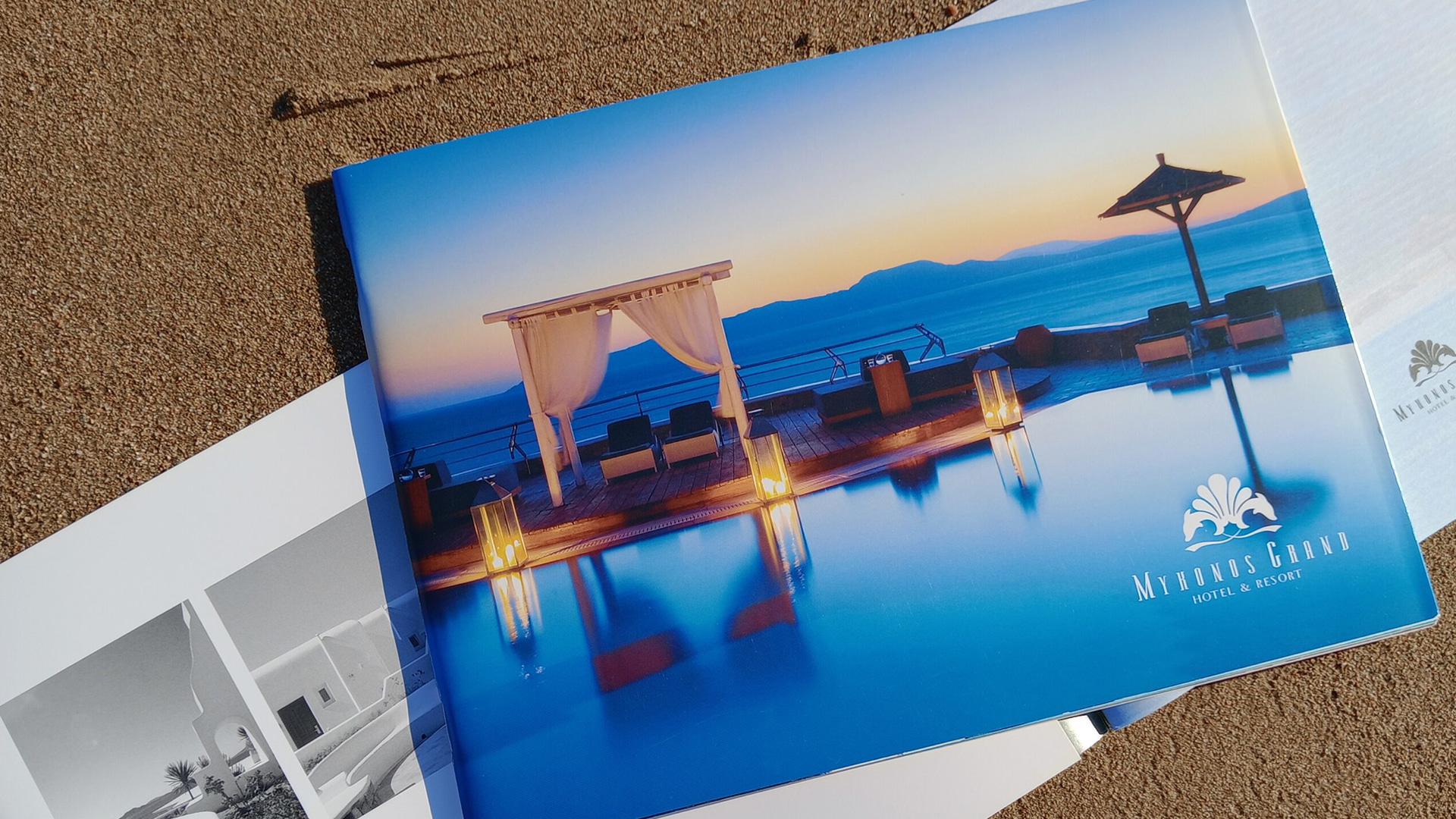 Υλοποιήσαμε έντυπα υλικά που αποπνέουν την ίδια αίσθηση πολυτέλειας — από μπροσούρες και μενού μέχρι εκλεπτυσμένες wine lists. Επιλέξαμε εξώφυλλα από λευκό ματ χαρτί με ανάγλυφο το λογότυπο των δελφινιών και λεπτές μπλε λεπτομέρειες που προσκαλούν στην εμπειρία. Στο εσωτερικό, εντάξαμε φωτογραφίες του χώρου — το γαλάζιο της θάλασσας, η θέα προς τη Δήλο, τα ψηφιδωτά — σε minimal συνθέσεις με μεγάλα λευκά περιθώρια και αυστηρή τυπογραφική ιεραρχία.