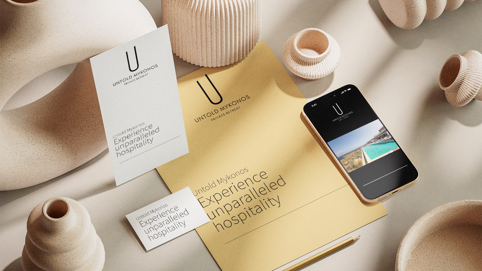 Η σχεδίαση του λογοτύπου επιτυγχάνει την ισορροπία ανάμεσα στο μοντέρνο design και τη διαχρονικότητα, καθιστώντας το οπτικά ευέλικτο, αλλά και συναισθηματικά φορτισμένο. Εκπέμπει μια ήσυχη πολυτέλεια, χωρίς κραυγαλέες υπερβολές – η ίδια η ουσία του Untold Mykonos. Η επιλογή της τυπογραφίας, των χρωμάτων και των αρμονικών αναλογιών ενισχύει αυτή τη διακριτική αισθητική, ενώ αποπνέει κοσμοπολίτικη φινέτσα και γαλήνη.