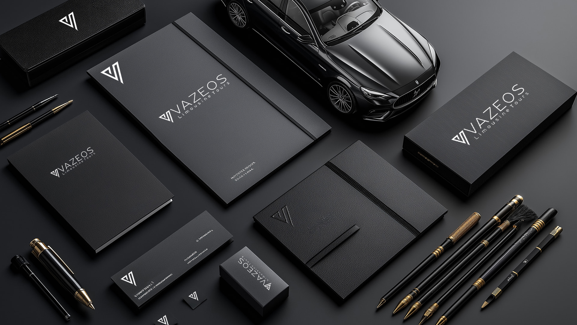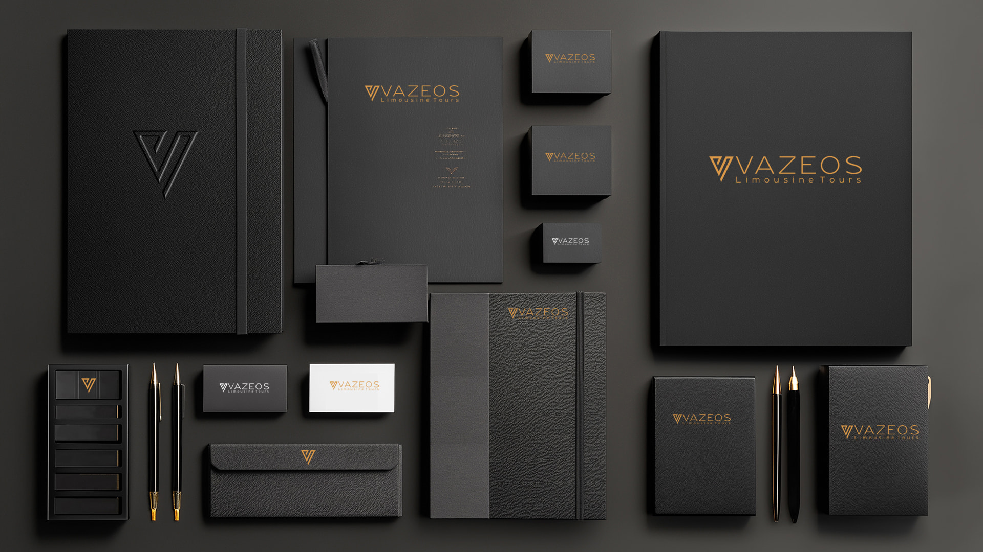 Η χρυσή ντεγκραντέ χρωματική παλέτα δεν επιλέχθηκε τυχαία. Συμβολίζει την πολυτέλεια, την αποκλειστικότητα και την υψηλή ποιότητα υπηρεσιών που χαρακτηρίζουν κάθε διαδρομή με τη Vazeos Limousine Tours. Συνδυάζεται με την κομψή τυπογραφία, δημιουργώντας μια ταυτότητα που επικοινωνεί αρμονία, φινέτσα και αξιοπιστία.